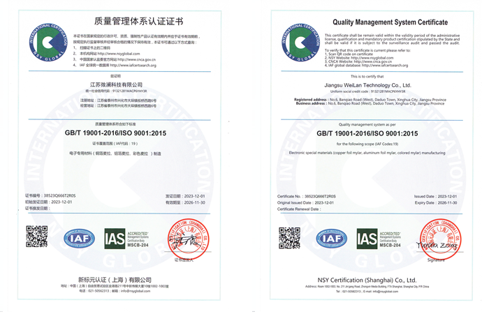 Jiangsu Weilan Technology Co., Ltd. was founded in 2023, is located in Dado Town Industrial Park, Xinghua City, Jiangsu Province. Specializing in the research and development, production, sales and service of shielding and insulation materials. Products include copper foil series, aluminum foil series, polyester belt series, copper-coated polyester belt, high temperature PI film, PTFE belt series, etc.